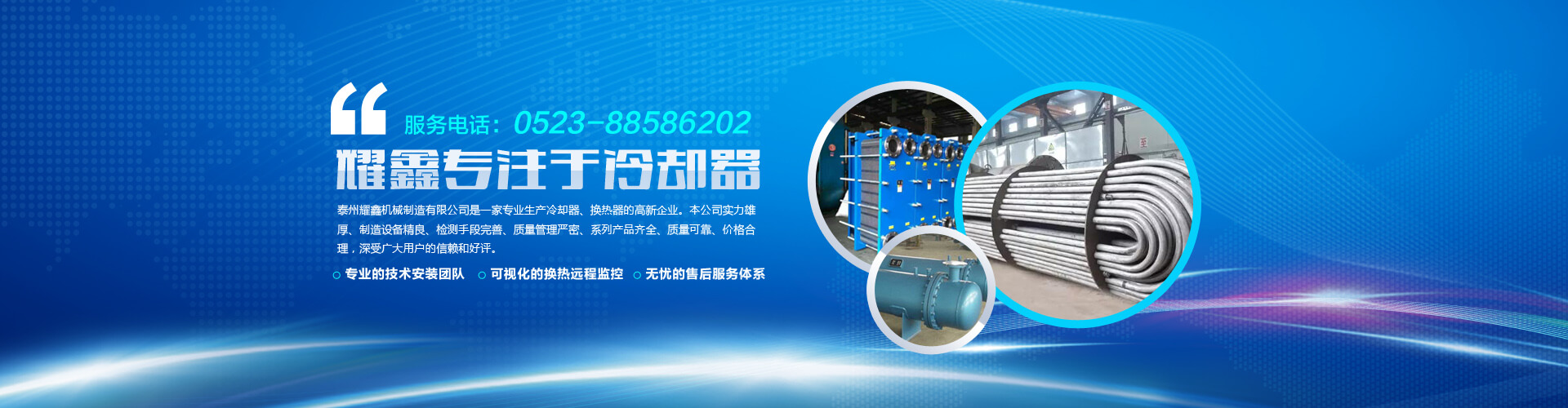 歡迎光臨泰州耀鑫機械制造有限公司官方網站,公司主營風冷卻器 油冷卻器 板式換熱器 列管式冷卻器 冷卻器